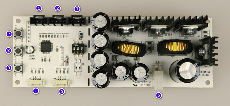 | 1 | 直插MOLEX插件 输出端口,接单线程IC类产品(如TM1804灯条,WS2812灯条),电压DC5V 5A驱动能力 |